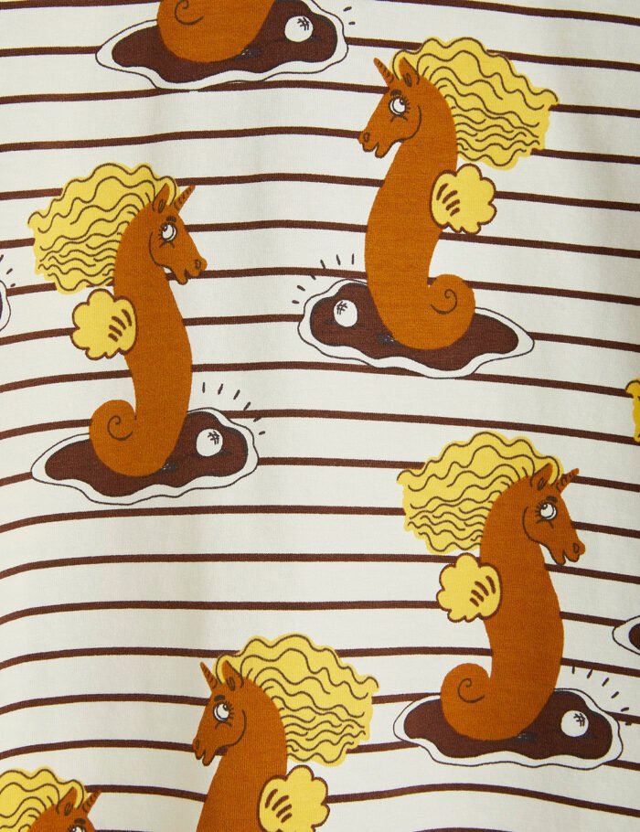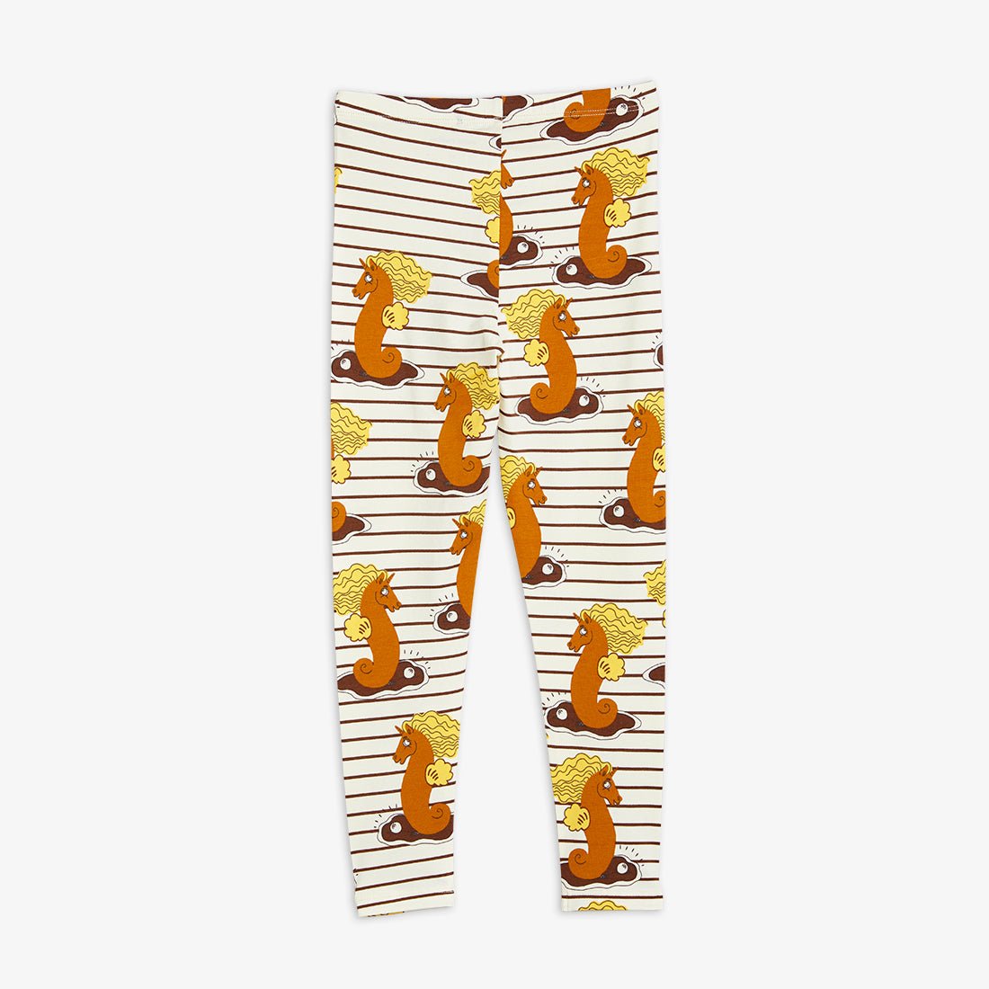 Mini Rodini Unicorn Seahorse aop leggings with all-over printed unicorn seahorse yardage on a striped white base. Made from GOTS-certified organic cotton with stretch for extra comfort.