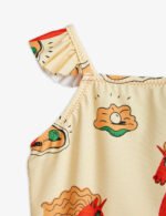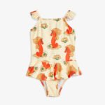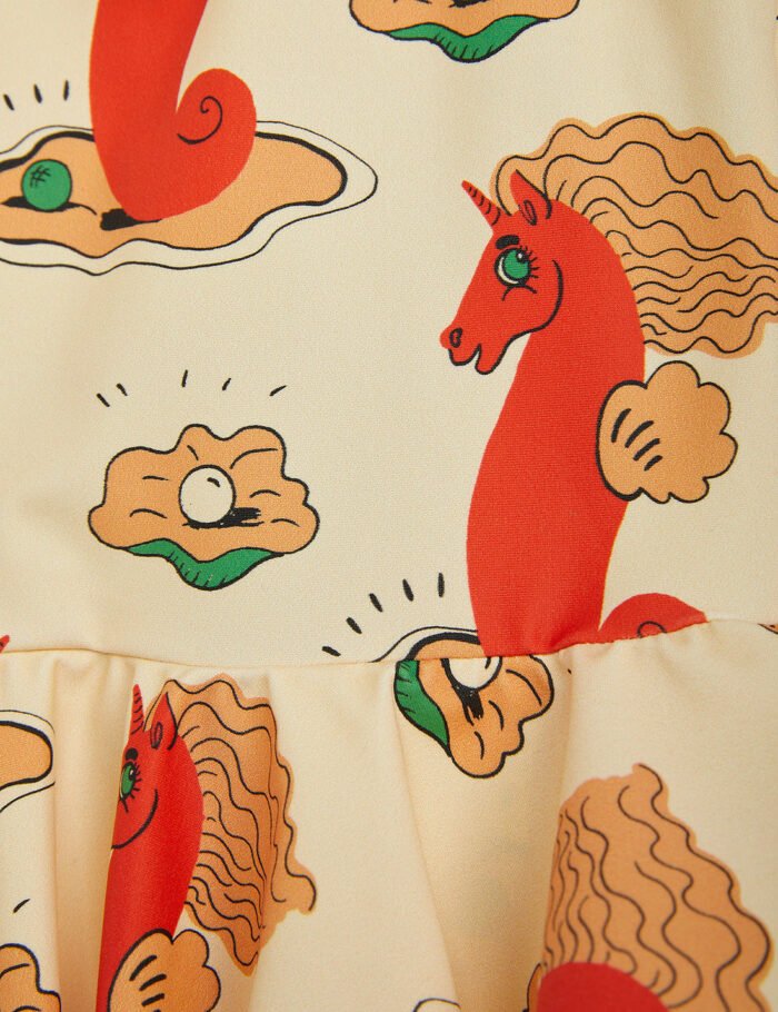 Let your child match their favourite unicorn seahorse in this dark cream base swimsuit featuring a colorful yardage print all-over unicorn seahorse. The swimsuit is made from recycled polyamide with a hint of stretch for extra comfort. and is designed with a chic frill skirt and frill on top of the adjustable shoulder straps. The fabric creates a physical barrier against the sun’s UV rays with the highest ultraviolet protection factor. UPF 50+.