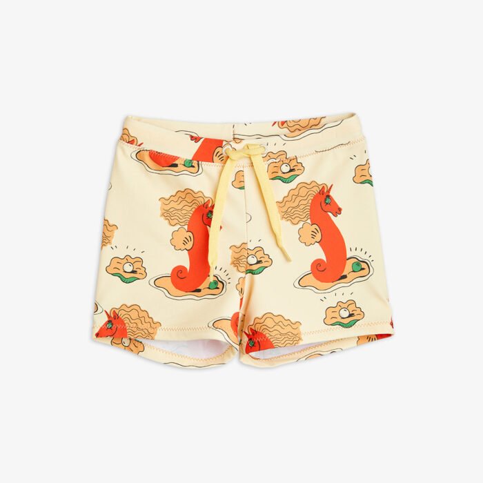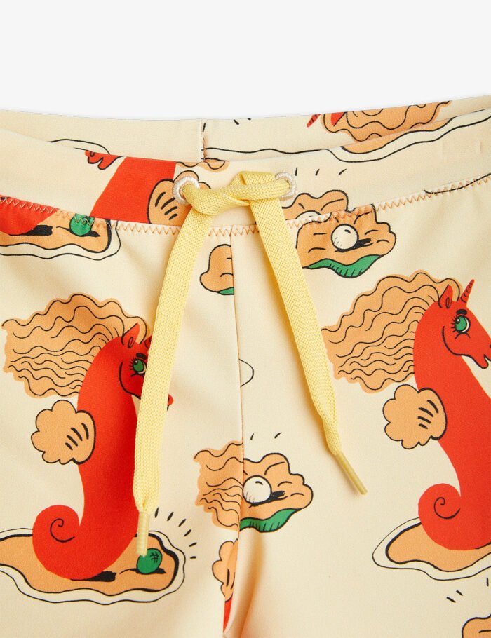 Let your child match their favourite unicorn seahorse in this dark cream base swimsuit featuring a colorful yardage print all-over unicorn seahorse. The swimsuit is made from recycled polyamide with a hint of stretch for extra comfort. The fabric creates a physical barrier against the sun’s UV rays with the highest ultraviolet protection factor. UPF 50+.
